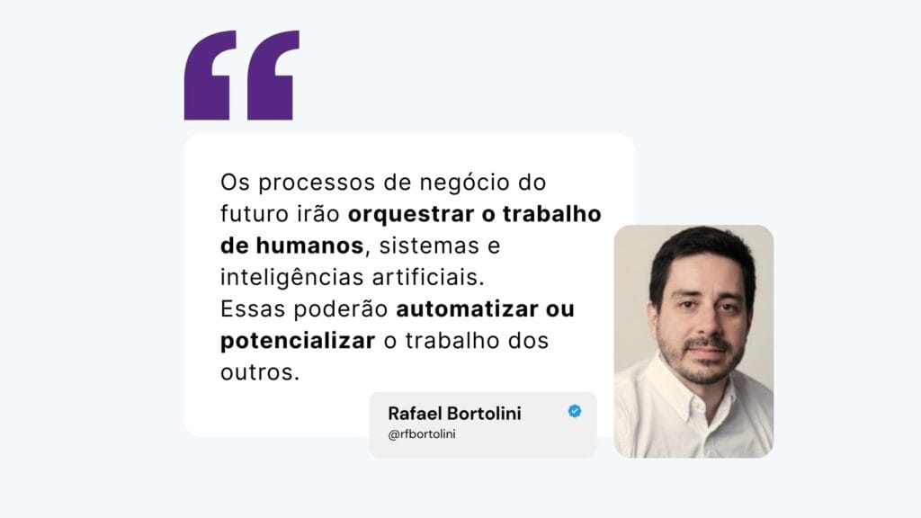 No webinar sobre IA e processos, Rafael Bortolini que é Diretor de IA e mestre em engenharia de produção pela UFRGS explica que os processos do futuro serão orquestrados por humanos, sistemas e inteligências artificiais ao mesmo tempo. Isso significa que agentes “respondem” apenas. Eles operam. Eles são parte viva do processo.