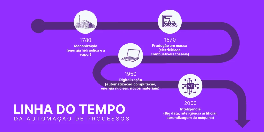 A automação de processos tem suas raízes na Revolução Industrial, quando as máquinas começaram a substituir o trabalho manual em larga escala. Nos anos 80 e 90, os sistemas ERP (Enterprise Resource Planning) começaram a integrar processos de negócios, e na última década, a introdução do RPA e BPMS transformou ainda mais o cenário empresarial.