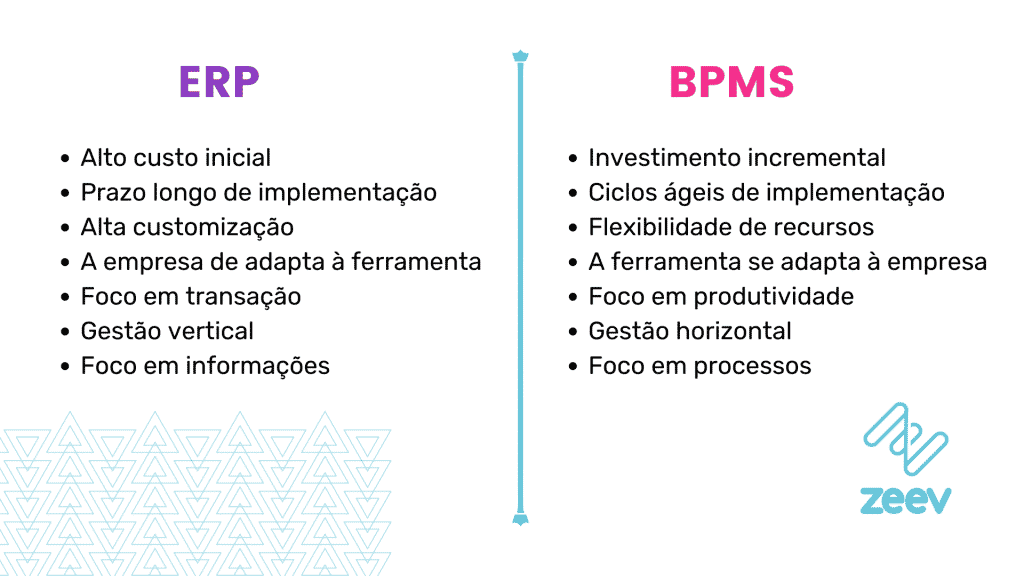 A diferença entre ERP e BPMS está na maneira com que eles trabalham, o BPMS é focado em processos enquanto o ERP possui módulos verticais (Compras, RH, Financeiro, etc.). O BPMS tem como objetivo fazer a comunicação horizontal entre esses departamentos. Ou seja, são duas ferramentas complementares.