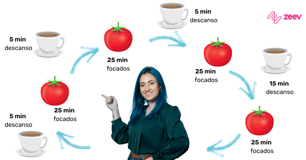 Você começa realizando uma atividade por exatos 25 minutos, com foco total nela. Após esse período você descansa por 5 minutos. E novamente o ciclo se repete: 25 minutos de foco e 5 minutos de descaso. Até completar as duas horas. E, como recompensa o último ciclo de descanso é de 15 minutos (ou seja, você terá 10 minutos a mais para relaxar até começar o próximo ciclo).