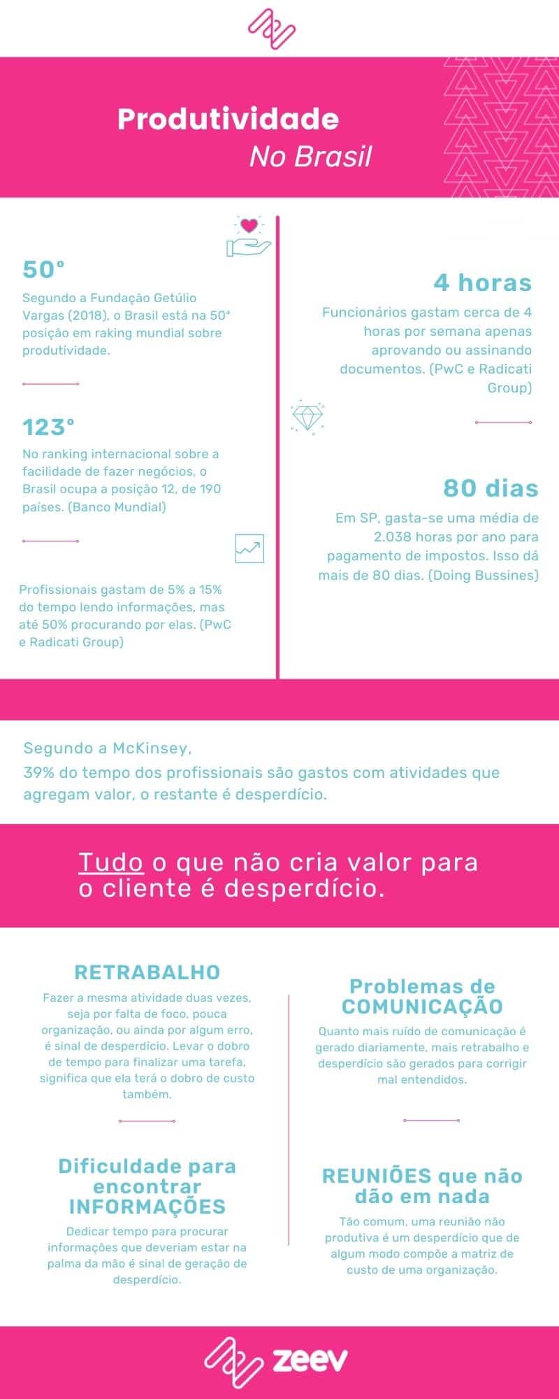 Assim, a produtividade está relacionada com a qualidade da entrega, mais do que à quantidade de entregas. Você sabia que a evolução da produtividade de pessoal aumentou pouquíssimo, no Brasil, nos últimos anos? De 1990 a 2018, apresentou apenas 1,3% de evolução, de acordo com a McKinsey. Sendo assim, é cada vez mais evidente a necessidade de melhorarmos nesse quesito. Observe esse infográfico e veja como a produtividade, no Brasil, precisa ser melhorada.