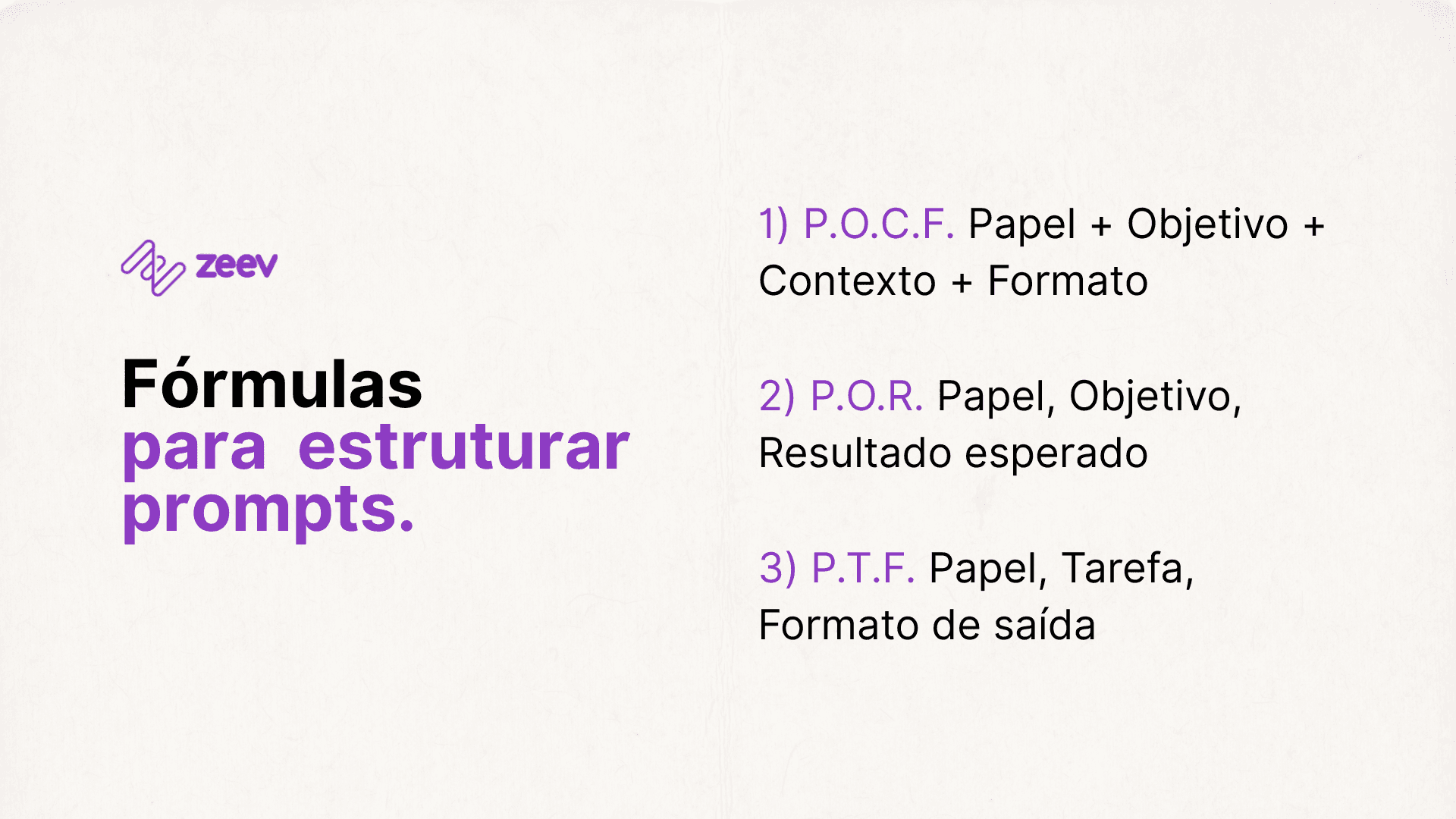 A fórmula mais conhecida é a POCF que significa: Papel, objetivo, contexto e formato. Ou seja, você precisa escrever todas essas coisas para que a IA te entregue um bom resultado. Mas existem outras como: POR e PTF. Abaixo você vai conseguir comparar a diferença entre as fórmulas usando o mesmo caso real para comparação.