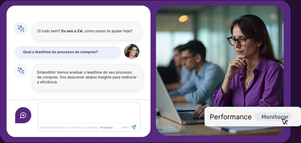 Utilize o poder da IA para consultar e analisar dados de processos. Controle processos de forma simples e peça insights de melhoria aumentar a eficiência dos seus processos mais importantes.