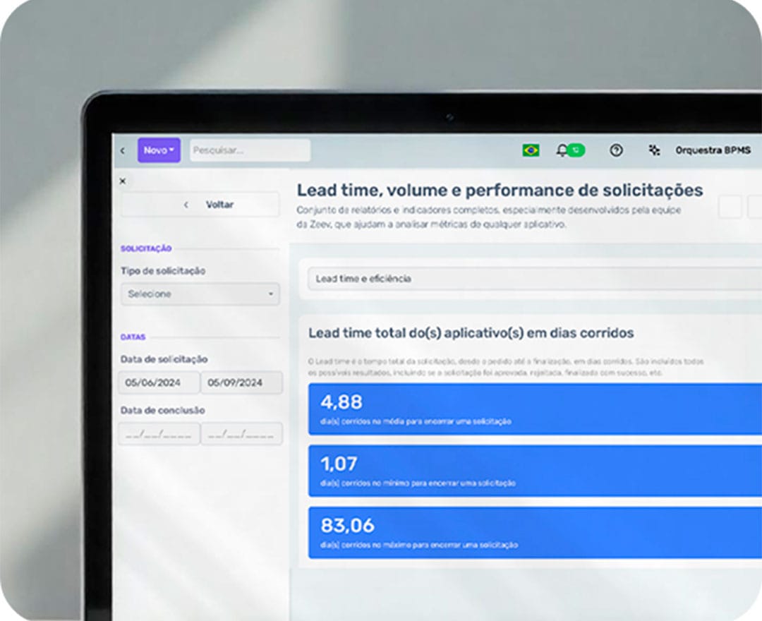 Utilize os painéis de indicadores nativos do Zeev para monitorar o desempenho de tarefas e do time. Se preferir, crie também painéis personalizados para o que você precisa ou utilize IA para analisar e melhorar seus processos. Identifique gargalos e tome decisões baseadas em dados.