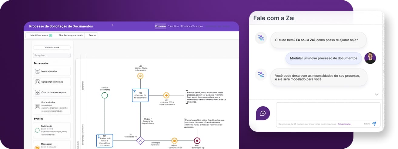 Explique seu processo para a Zai, em liguagem natural, e ela fará o resto por você, utilizando BPMN.