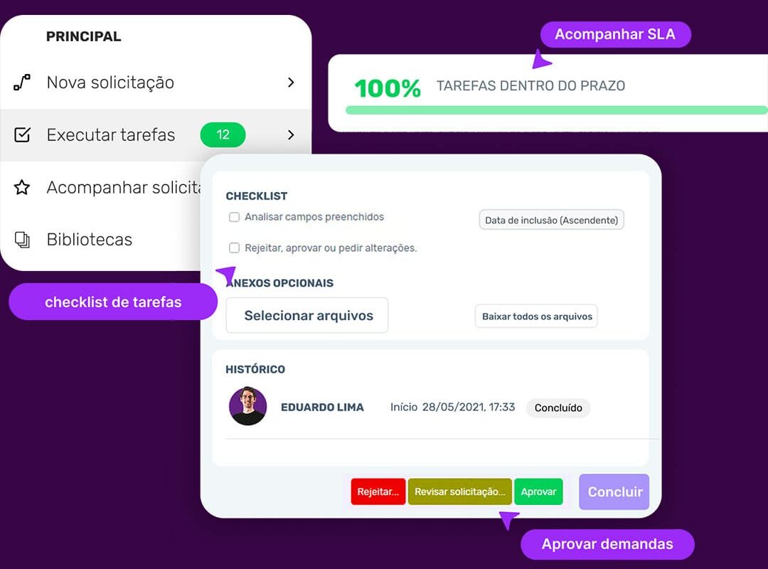 Centralize as demandas da organização em uma única ferramenta, onde você inicia solicitações, executa tarefas e monitora os processos que abriu ou nos quais participa, além de acionar Agentes de IA para executar etapas operacionais de forma autônoma.