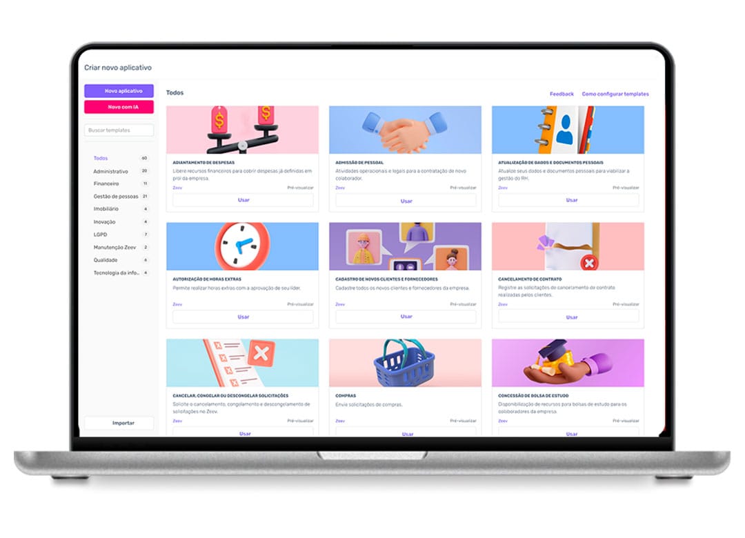 Se você não quiser modelar do zero, você pode explorar os templates gratuitos do nosso marketplace ou utilizar os recursos de IA disponíveis na nossa plataforma.